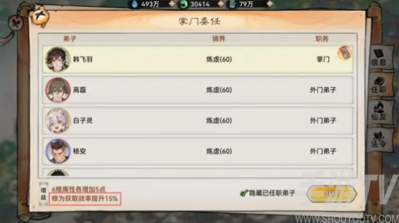 掌门的修为获取效率提升15%;长老的修为获取效率提升10%,内门弟子的修为获取效率提升5%。