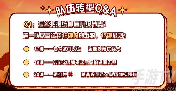 比如按照说的刚刚的队伍成型倒推,第一队尽量选择19御内的武将最佳,17御最好。