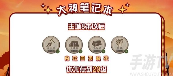 2、主城在8本以后开始把内政四项科技优先点到20级!升级到八本后基本就没有特别关键又比较紧急的城建建设了,这时候把资源科技提升到20级所带来每日产量的提升和屯田的收益是非常可观的。