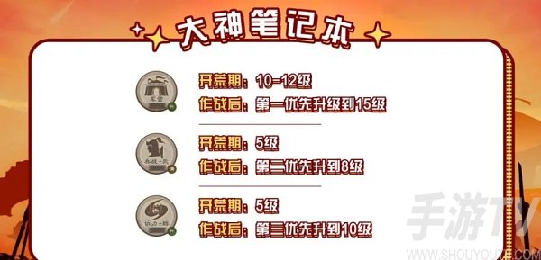 3、军营开荒期10~12级左右满,作战后第一优先升级到15级左右。兵战开荒期各5级,作战后第二优先升到8级。协力开荒期升到5级,开战后第三优先升到10级。征兵前期则是根据任务进度来定开。