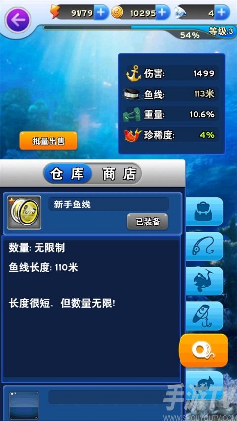 1、如图所示,这是系统为新手玩家提供的默认鱼线长度,总长为110米,长度很短,但使用数量无次数限制。