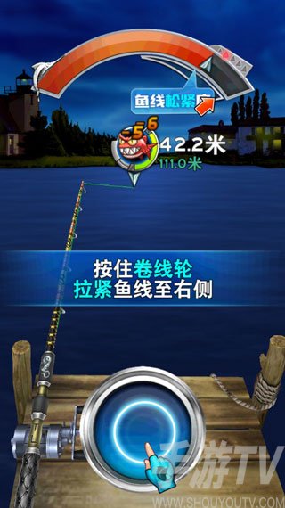 在游戏中按住中间的按钮就是收线,松开就是放线。我们最终的目的是要将鱼拉上岸来,从而完成整个钓鱼过程,但是一直按着按钮收线是不可能的。因为我们还不能让鱼线绷得太紧,否则便会造成断线。