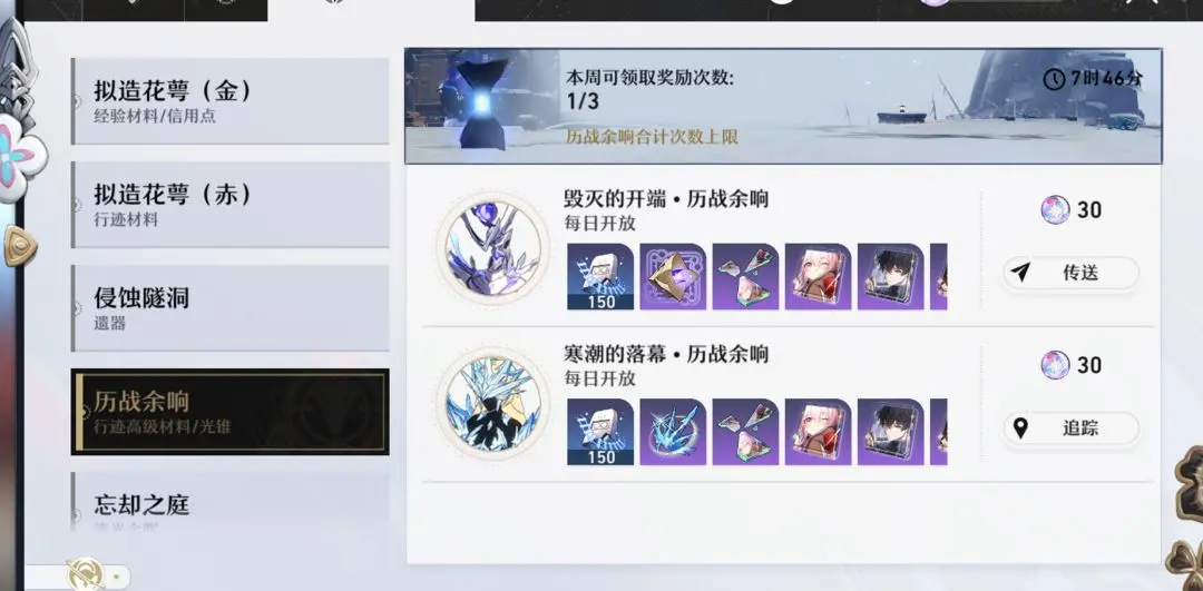 天赋升级需要的周本材料,铁道周本叫历战余响。周本会提供遗器,天赋素材,光锥,摩拉。具体获得什么当然还是得看运气了。