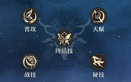 角色行迹共五个;普攻,战技,终极技(大招),天赋,秘技。其他四个容易理解,秘技主要使用在跑图上,如开打前加buff等