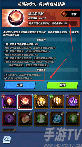 【专属效果】部分高品质终结技还存在额外的专属效果,上阵特定要求幻化龙类型并装配对应专属终结技时即可点亮,战斗内的技能效果将进一步增强!如:选用“焰爪的克制”将为法夫纳增加炙热火球发射数量!