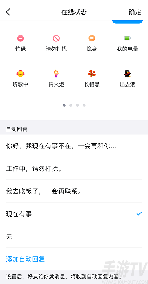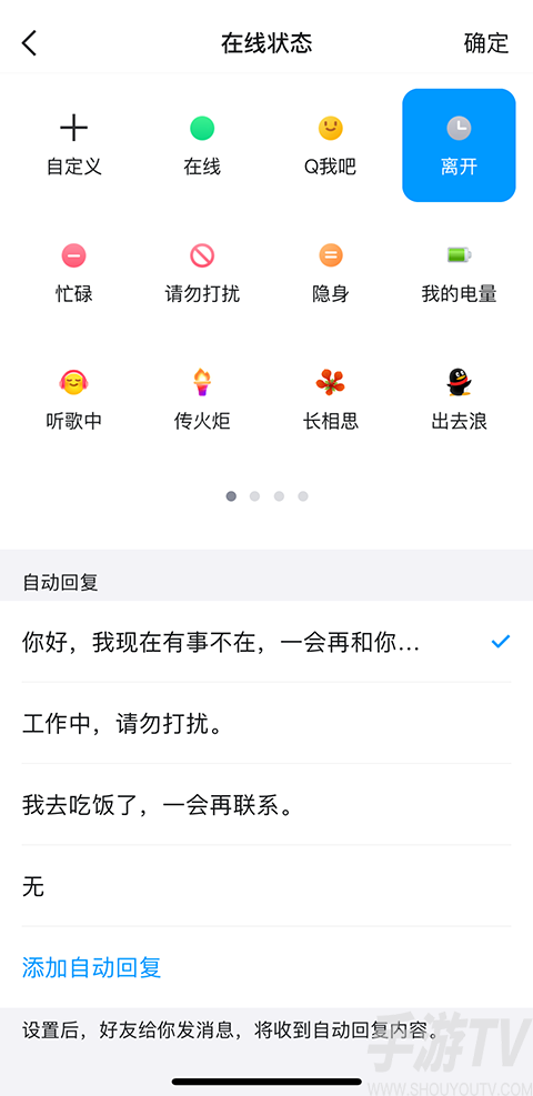 5、选择离开选项,点击一下。可以看到下面有自动回复的选项可以选择,可以自行选择。