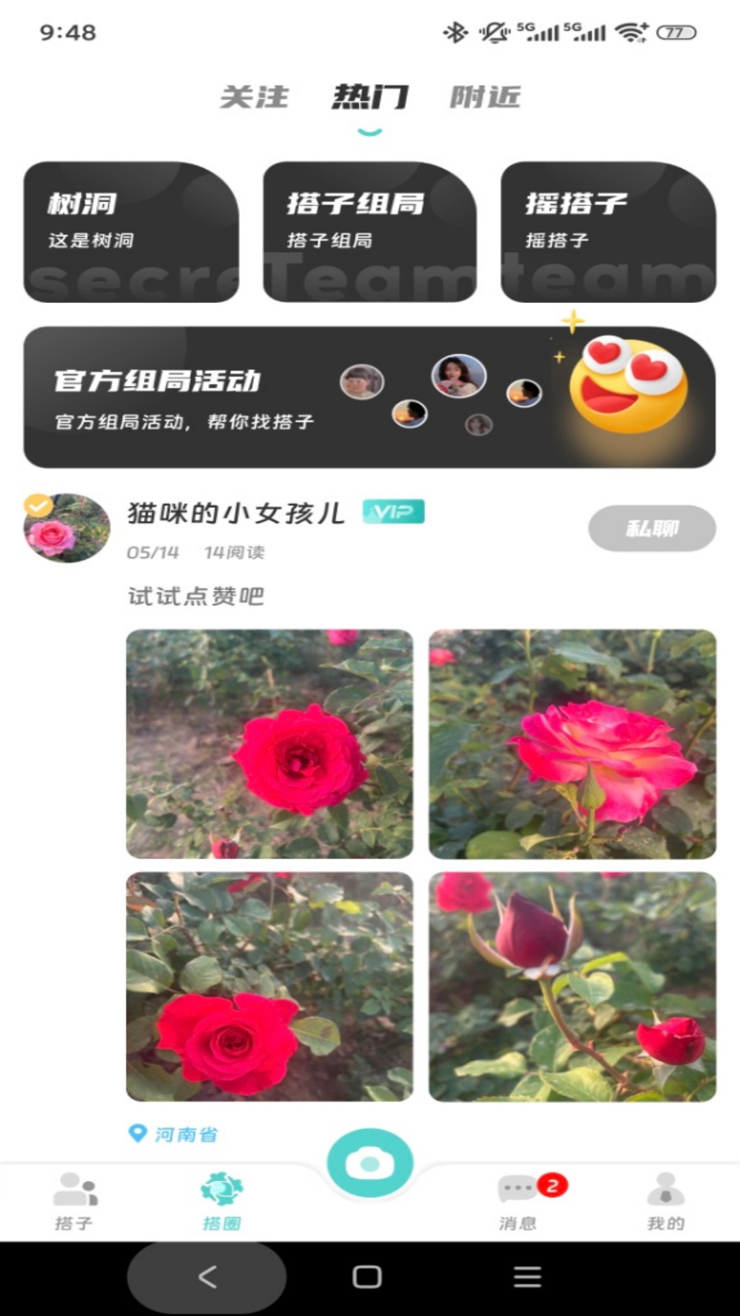 3、精准兴趣社交:除常见的星座、爱好、城市等标签,还细分了如二次元,摄影器材党,职场新人等垂直领域标签,用户可勾选多个标签,系统据此进行深度匹配,确保推荐的搭子和群组与自身兴趣高度契合,避免无效社交,提升社交质量。