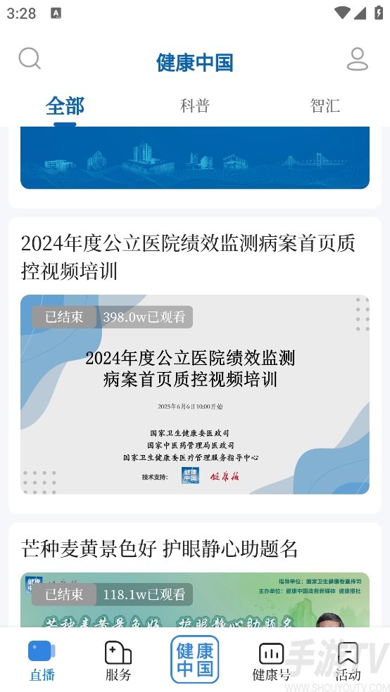 1、打开在本站下载的健康中国官方版,点击进入首页中的直播,里面有非常多的健康直播讲座内容提供,用户可在这里自由查看。