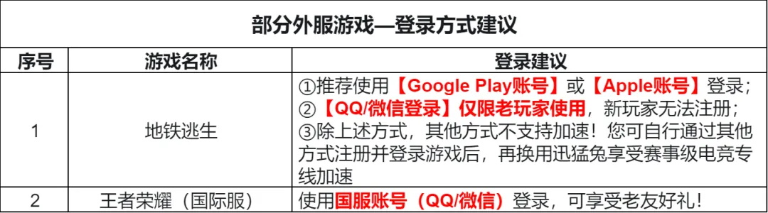 外服游戏主要运营区域大多数不包括国内,故部分游戏会针对国内IP进行阻断,当您直接尝试登录游戏时会出现错误提示,您需要使用迅猛兔加速后方可进入游戏。加速后仍无法进入游戏,建议您更换其他游戏登录方式尝试,部分游戏对登录方式进行严格限制,或联系兔兔进行反馈!
