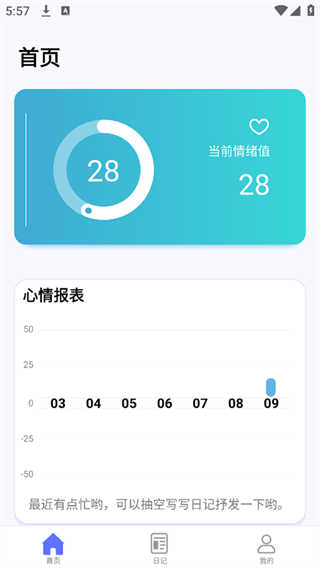 在记录心情的同时,系统会自动生成对应的情绪值,并在首页直观展示近期心情趋势,为用户提供针对性的心态建议。