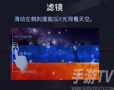 滤镜滑动左侧刻度能以可见光/X波段/红外波段观看天空。