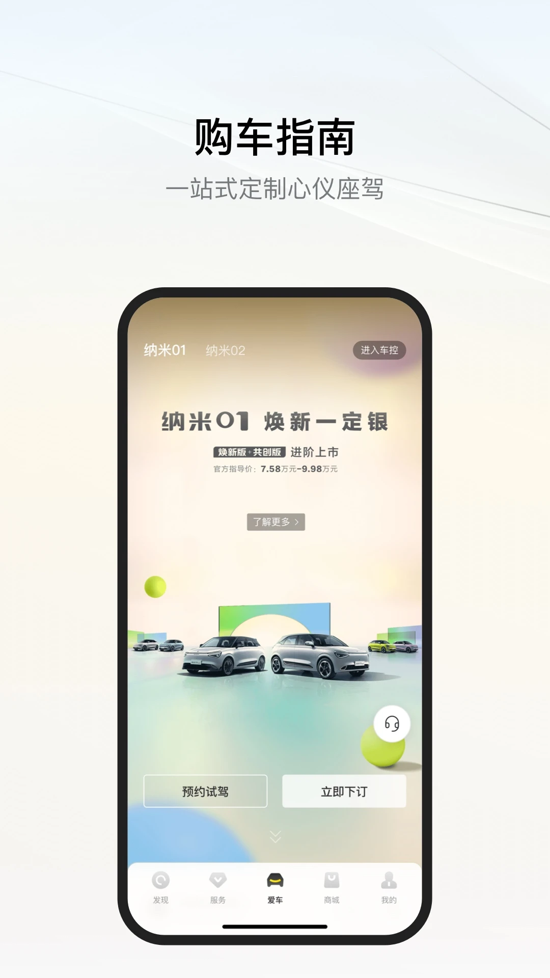 选车:可以全面了解东风纳米汽车产品优点,进行线上预约试驾,在线购买个性化配置的爱车。
