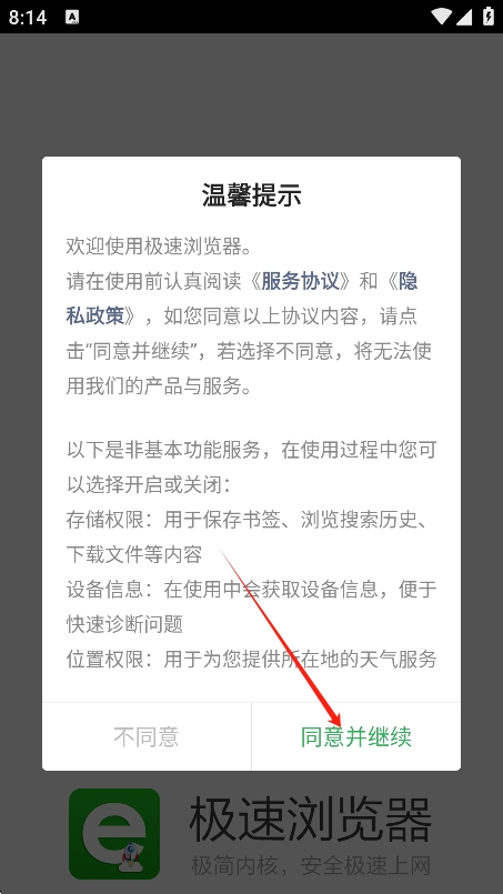 1、在本站下载安装极速浏览器海外版并打开同意相关的用户协议