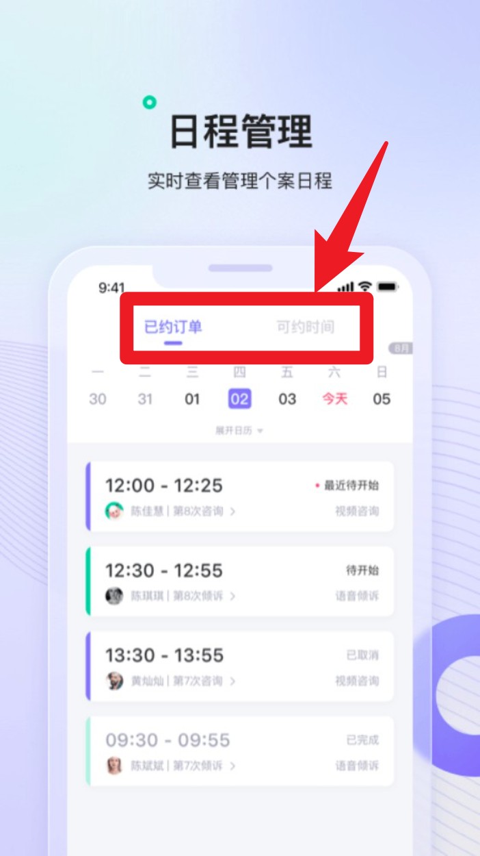 2. 登录后可进入“日程管理”页面,点击“已约订单”查看已排定咨询时段,亦可切换查看可预约时间。