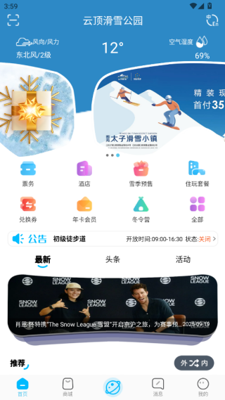 云顶滑雪公园手机版是一款由密苑云顶乐园度假区官方退出的滑雪相关服务软件。软件为用户提供了在线购票、预定酒店以及租赁雪具等服务。并且软件还可以随时查看滑雪课程和最新的天气情况,用户可以根据这些内容制定行程。为用户的滑雪之旅带来更多的便利。
