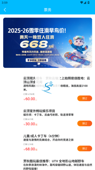 2.APP为大家提供了票务、酒店、雪季预授、住玩套餐等等多种功能。