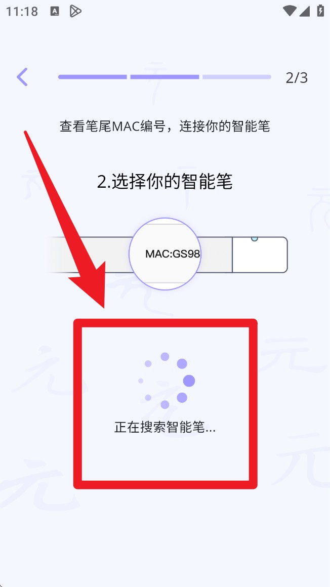 3. 界面会显示可用设备列表,选择与笔尾 MAC 编号一致的设备进行绑定,完成后系统会自动跳转至主页面。