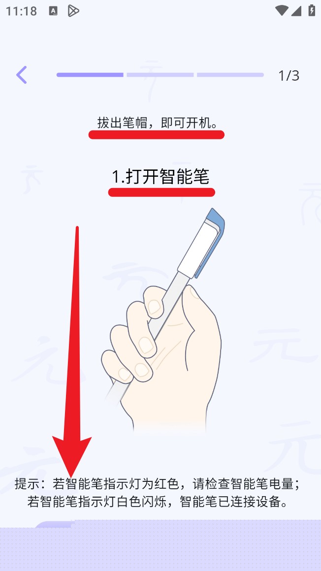 2. 拔出笔帽后,智能笔自动开机,根据提示观察指示灯状态,白灯闪烁表示已连接,红灯则代表电量不足。