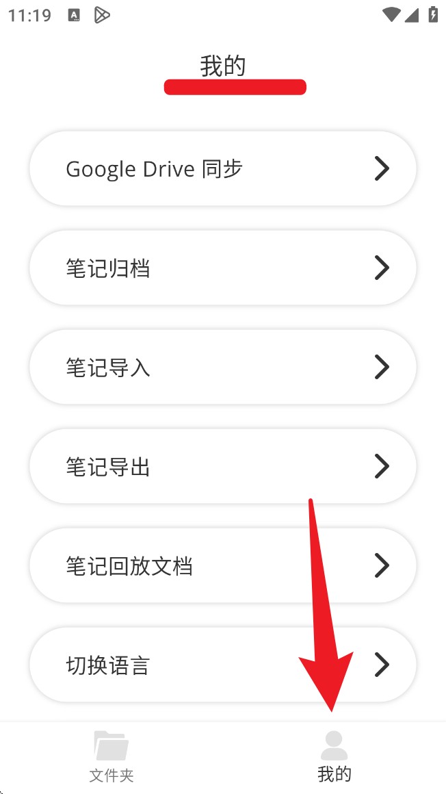 4. 点击底部“我的”页面,可进入设置界面操作笔记导入、导出或开启 Google Drive 同步等扩展功能。