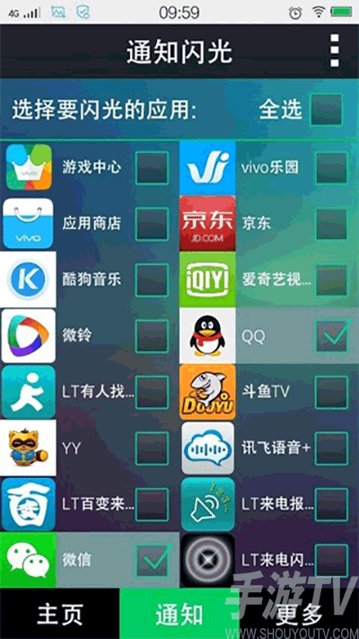 4、开启后返回到通知设置界面,此时我们勾选QQ,微信即可实现QQ,微信闪光,收到新消息闪光提醒功能,其它应用软件闪光同理勾选上即可。