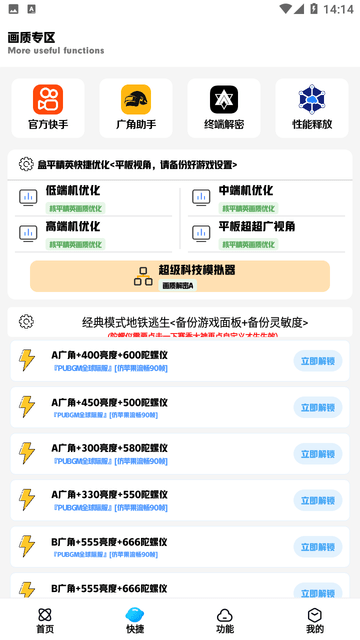 画质解密A是一款为游戏用户打造的画质优化工具,软件界面简洁,操作简单,提供了丰富的功能,能够修改分辨率、帧率、广角等参数,让手机流畅运行高画质游戏,同时提升游戏画面的流畅度,让用户的游获得更好的游戏体验,提升获得的乐趣。