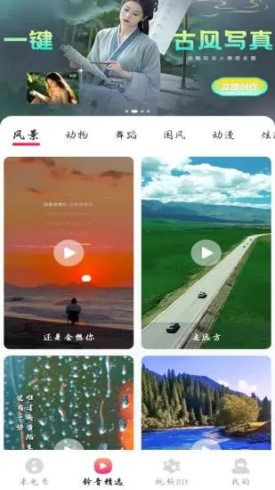3、在铃声精选页面中有风景、国风、动物、舞蹈、动漫等不同的铃声,还可以进行一键古风写真;