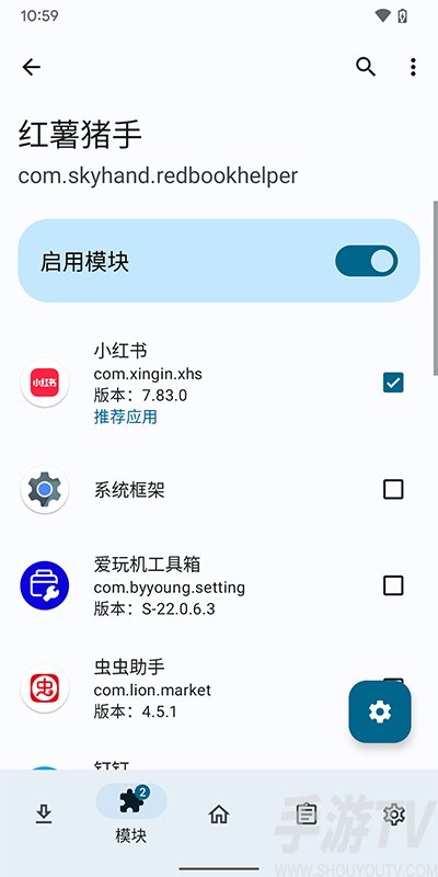 2、在框架管理器当中点击红薯猪手,启动模块,选择小红书进行应用。