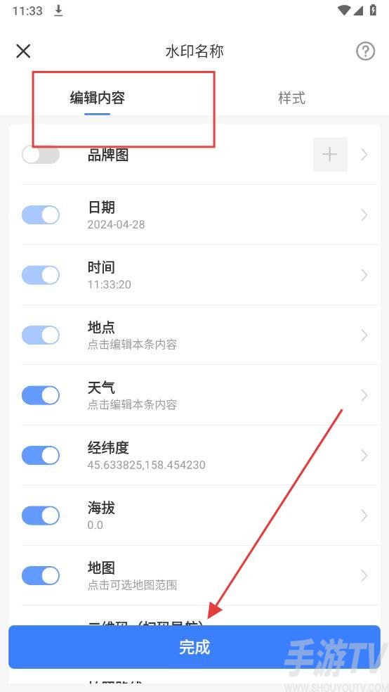 2、搞定相机水印水印名称编辑页,编辑内容标签下,可开关品牌图、日期、时间等水印组件,按需勾选后点完成,快速配置专属水印模板,DIY更灵活。