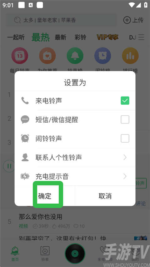 3、选择来点铃声,点击【确定】就设置好了。