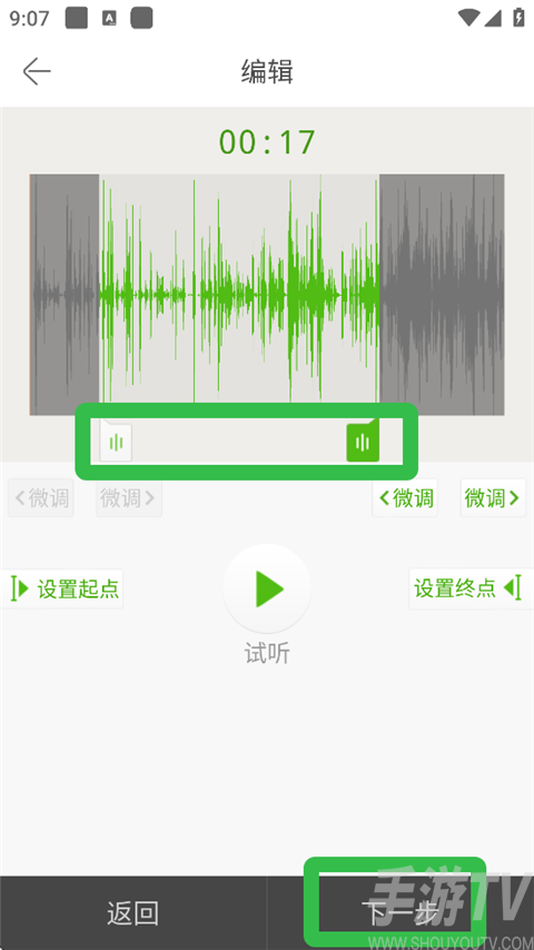3、拉动左右两个图标将铃声截成自己想要的效果,点击【下一步】。