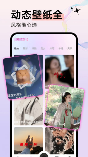 咪果铃声多拥有者大量的壁纸和手机铃声,许多铃声不仅好听,更是可以免费下载。里头的壁纸资源同样精彩,涵盖简约风、潮流范、可爱系与卡通元素等多种风格,帮助用户打造独一无二的手机界面。赶快下载体验吧!