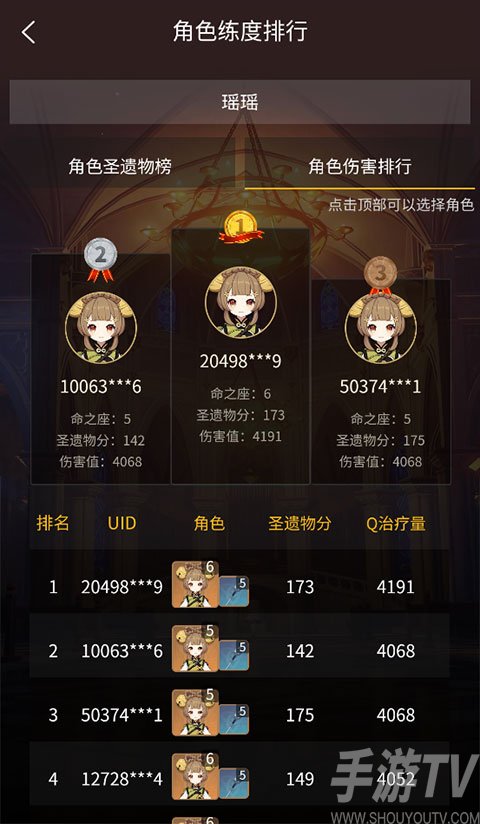 2、然后从上方的角色圣遗物榜切换到伤害榜,点击顶部的名称可以选择不同的角色进行查看。