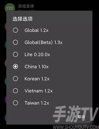 选择对应的游戏版本非常重要,若用户游玩的是《和平精英》则需勾选“China 1.10x”,若为国际版则选择“Global 1.2x”,确保画质调整适配当前游戏。