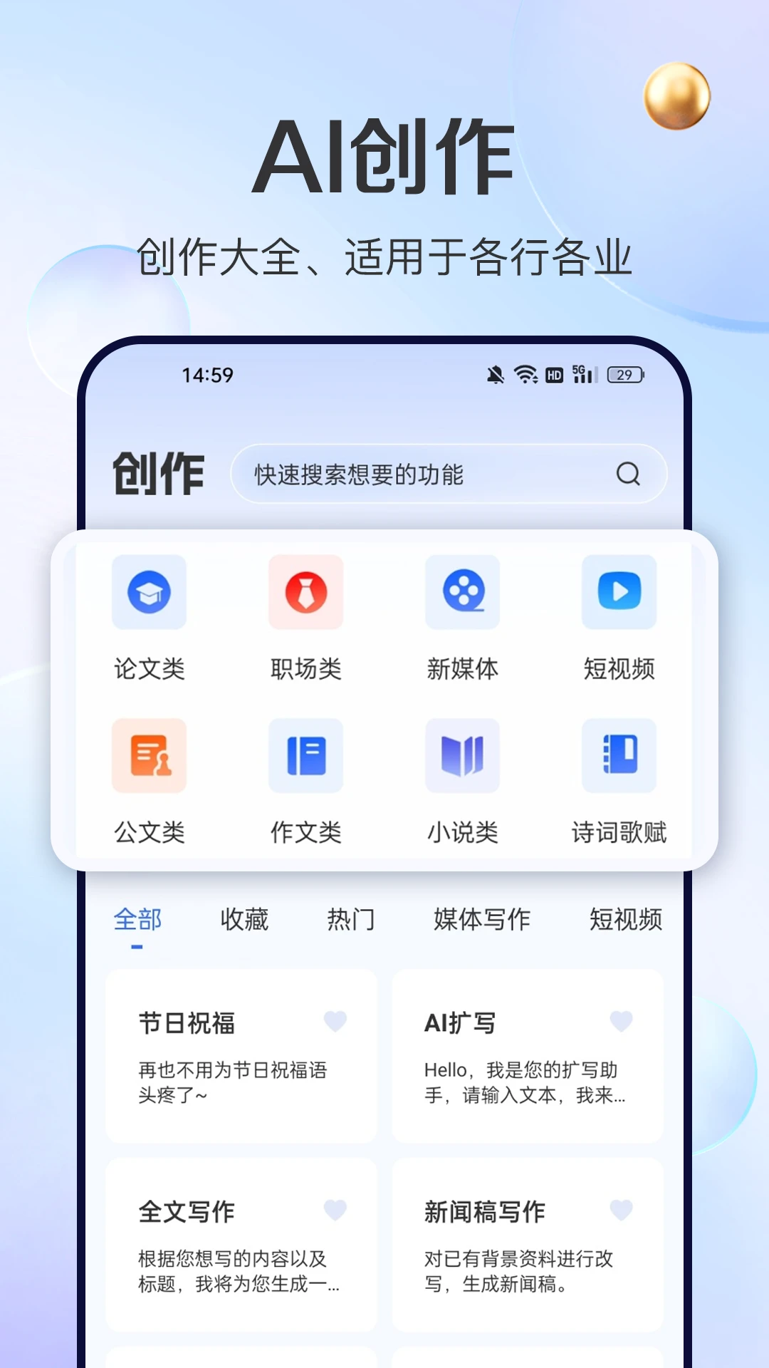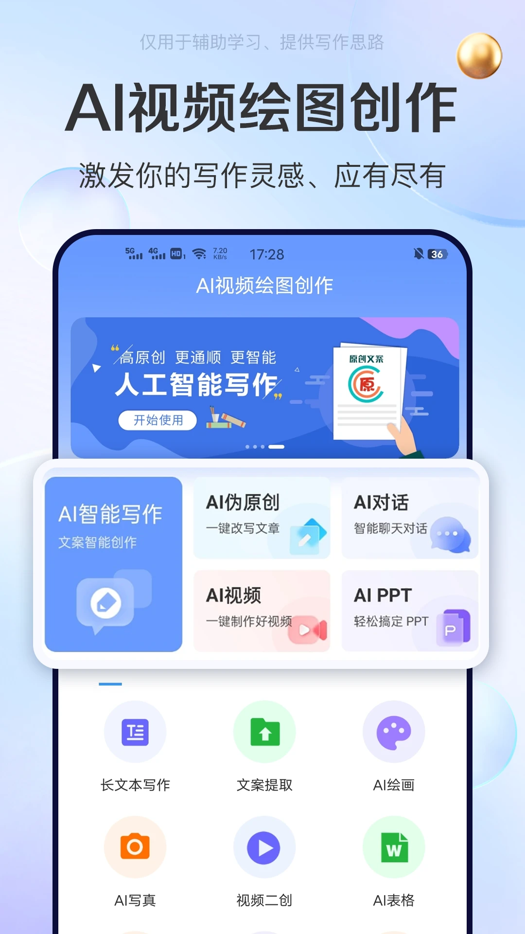 - 图文写作:生成内容框架、润色文字,支持搜图、生图。