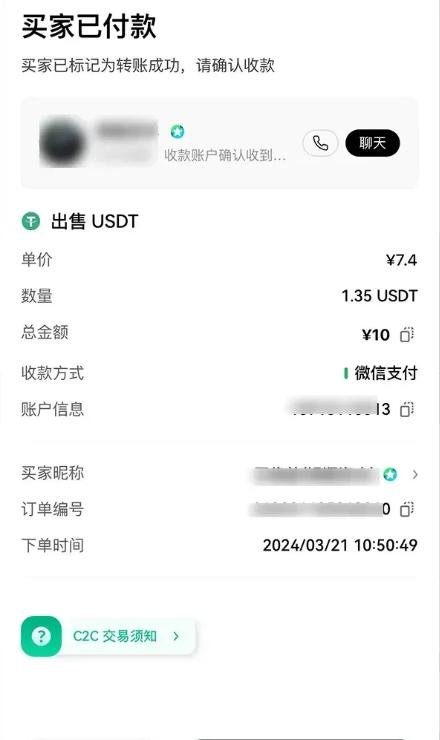 3.可通过【聊天】功能与买家沟通,买家付款后请务必登录微信/支付宝/手机银行核实到账情况。确认收款后及时点击【我已收到付款】并放币给买家。