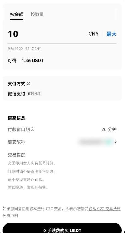2.选择可交易的商家进行购买按金额或者数量填写所需的数字资产注意商家要求的【支付方式】和【支付时长】点击【0手续费购买】订单生成点击【获取付款详情】按照【商家账号】进行支付付款成功后点击【我已支付】点击【确认已转账】商家收到款会进行放币。