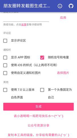朋友圈转发截图生成工具是可以生成不同风格的微信朋友圈图片的软件。软件提供了多种模板给用户进行选择,用户也可以自定义截图中的头像、昵称、时间等信息,包括纯文字、分享网页/公众号文章、图片(单张、九宫格)等,使截图更符合个人特点,来满足不同用户的使用需求。