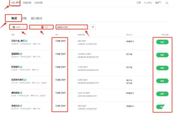 4、在C2C买币进行交易,根据需求选择合适商家,点击购买,而后根据提示进行付款、等待商家放币(若是长时间没有收到币种,可联系客服进行处理)