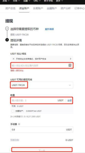 7、在提现详情提币地址处输入转账地址,提现网络选择TRC20,输入数量点击下一步(注意提现网络和充值网络需要选择一致。不然可能造成资产丢失),然后就完成虚拟币转账操作了。