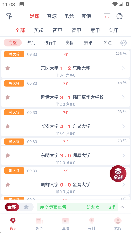 五大联赛、欧冠杯、亚冠杯统计数据,从联赛积分、 交锋记录、近期战绩、进球时间、大数据推算等多维度分析比赛;