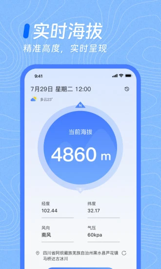 【高度表】实时测量海拔,无需网络就可以准确测量所在地的海拔和经纬度,支持单位在米和英尺间切换。