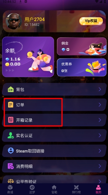最后在我的页面,可以进行查看开箱记录和购买的订单。