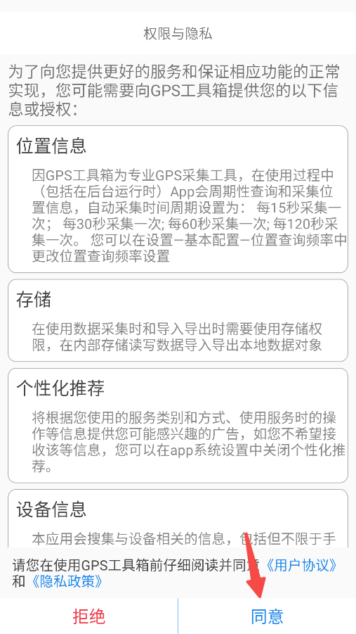 1、打开app会展示所需的权限,点击下方同意权限与隐私。