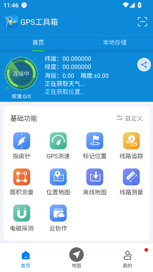 3、进入主页可以查看所在位置经纬度信息,还可以选择基础的功能。